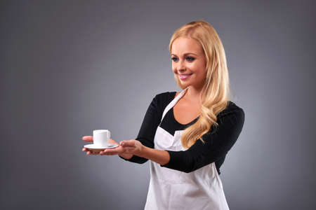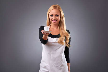 Waitress a tray with a cup of coffee or tea isolated on white background.