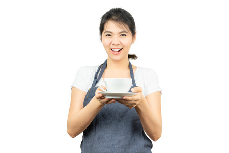Smiling Asian Waitree or barista in apron holding coffe cup isolated on white background