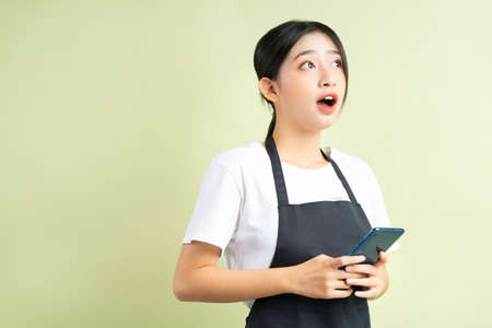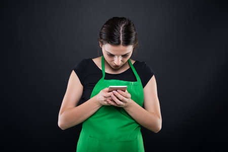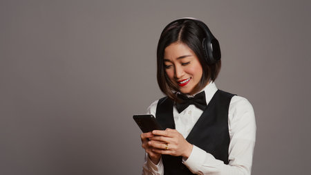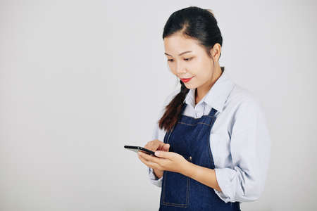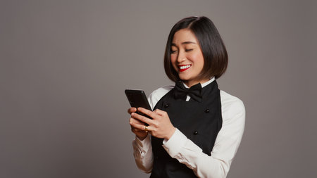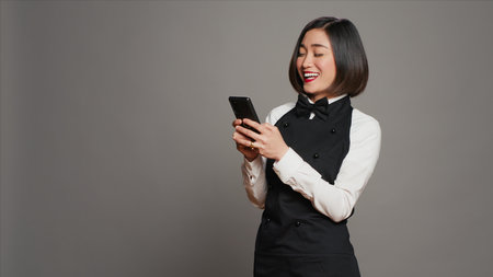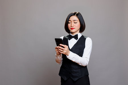 Waitress in uniform typing on smartphone, checking online order. Hotel restaurant asian woman receptionist texting on mobile phone, answering client messages while posing in studio