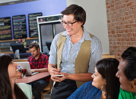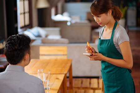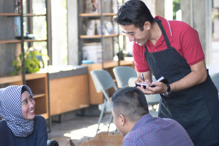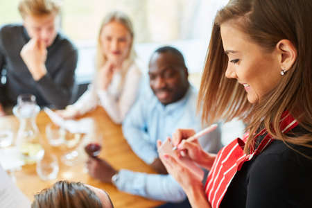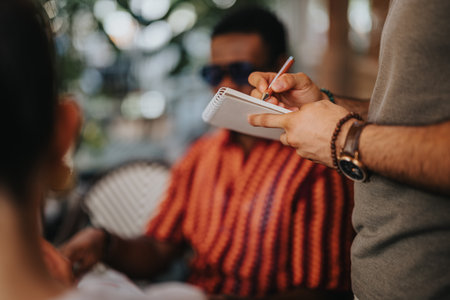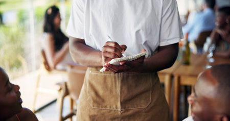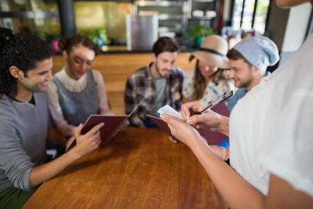 Service staff or waiter notes order from guests in the bistro or restaurant