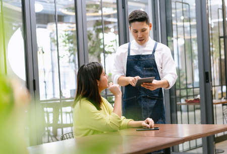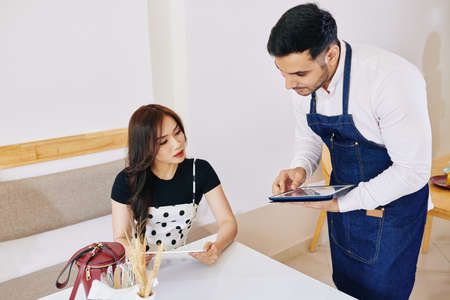 Cafe waiter using tablet computer when writing down order of pretty Asian woman