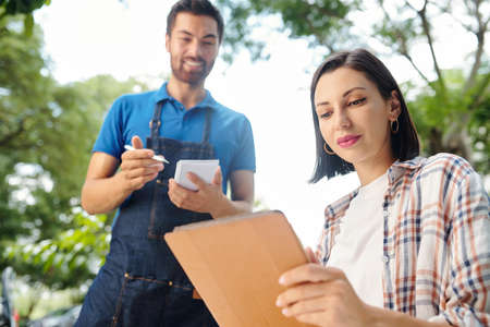 Caucasian middle aged man sitting at outdoor table talking to Hispanic middle aged woman holding notepad, man holding smartphone and gesturing while discussing order or business