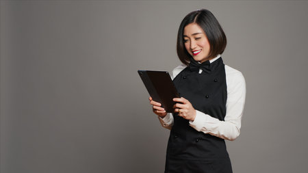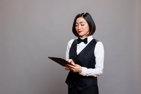 Restaurant administrator young asian woman using digital tablet while posing in studio. Attractive waitress wearing professional uniform and bow tie holding portable device