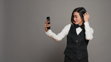 Attractive asian waitress adjusting bow tie and looking at smartphone front camera while taking selfie. Restaurant woman employee in uniform posing making photo on mobile phone