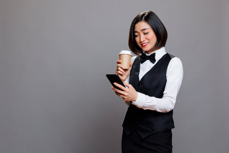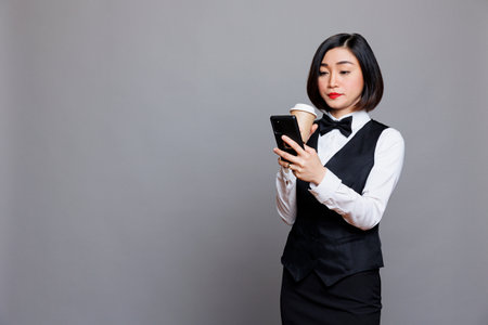 Young asian waitress drinking coffee and texting on mobile phone while posing in studio. Attractive woman wearing receptionist uniform holding beverage to go and typing on smartphone