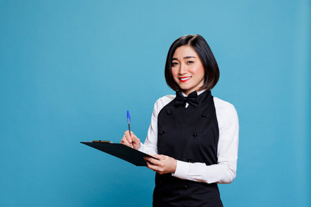 Smiling asian waitress wearing uniform holding clipboard, writing with pen and looking at camera. Cheerful woman receptionist taking notes studio portrait on blue background