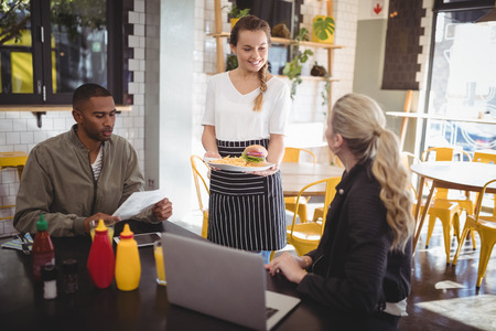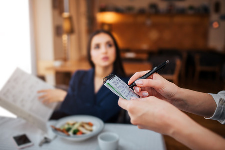 Nice young buisnesswoman sit at table in restaurant. She point on menu and look at waitress. She write order in notebook