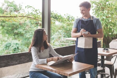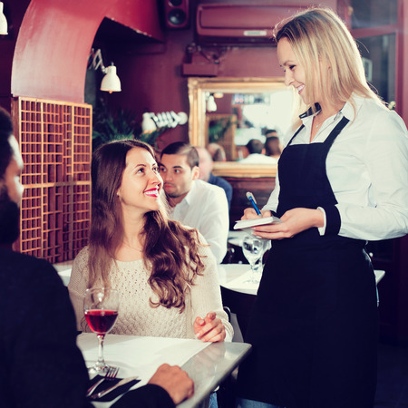 Waitress girl wearing apron standing holding notepad and pen ready take order talking with restaurant guests, married couple or heterosexual friends make order communicating with waiting staff concept