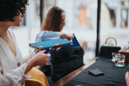 Business meeting in a modern coffee shop with people using technology and analyzing reports