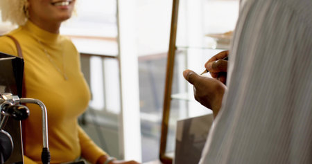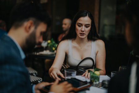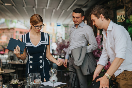 Close-up of multiracial friends wearing casual clothing paying waitress for dinner and drinks bill at bar