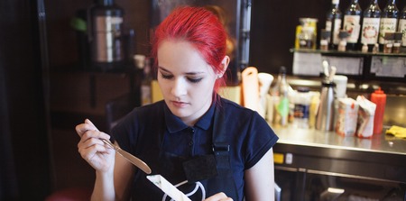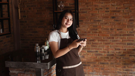 Asian Women Barista smiling and holding phone. Check online order from customer.