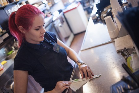 Female server taking order inside restaurant dining room using order pad and pen with folded cloth. Hospitality, service, interior, professional, casual, warm, ambiance