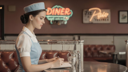 A waitress in a classic diner uniform diligently takes an order at a retro table
