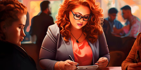 plus-size manager networking at a business conference, showing her confidence and industry expertise.