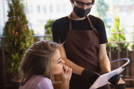 The waitress works in a restaurant in a medical mask, gloves during coronavirus pandemic. Representing new normal of service and safety. Taking orders with tablet contactless. Devices, service.