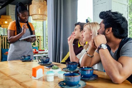 Diverse friends gathered together sitting in cafe talking with worker service waiting staff place make order food drink, young waitress business owner listening client wishes writing list in notepad
