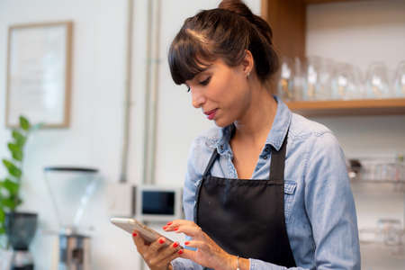 Smiling young coffeeshop owner checking orders from clients in mobile application