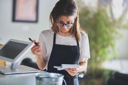 Portrait of a beautiful waitress writing down an order in paper notebook with pen. Server standing on restaurant terrace in an apron.