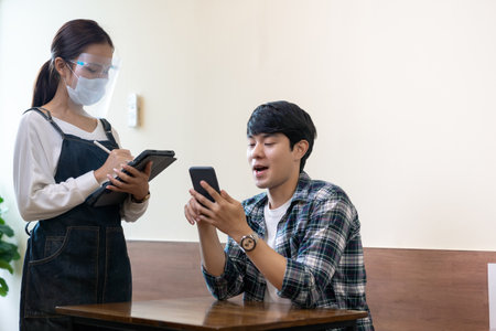 Man order food by smartphone touchless from waitress with face mask and face shield.