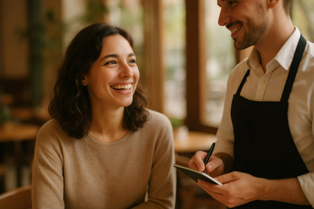 Smiling woman sitting at table, enjoying conversation with male waiter writing her order in a restaurant
