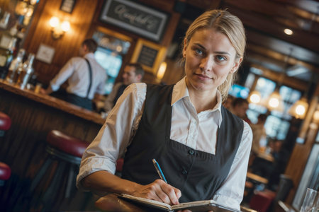 Portrait of waitress with a notebook takes an order. Waitress taking order on a notebook in pub. Waiter writing an order in bar at hotel