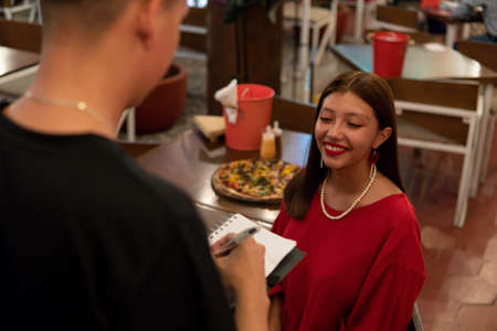 Smiling young Latin woman in a dress and red lipstick is sitting at a restaurant table asking the waiter for an order. In the background on the table you can see a pizza served.