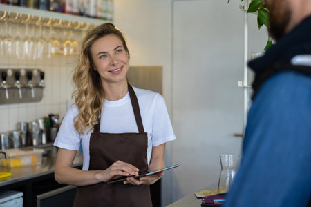 Asian waitress in apron taking order from smiling woman with tablet in warm cafe setting, engaging in friendly interaction and creating inviting atmosphere