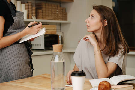 Waitress taking order from mature woman, sitting behind the table. Her worknotes, croissant, coffee and glass water bottle on a table.