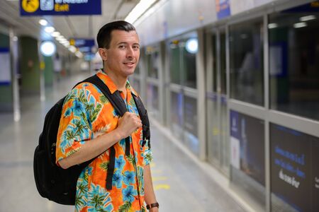 Young handsome tourist man waiting for train at the subway station