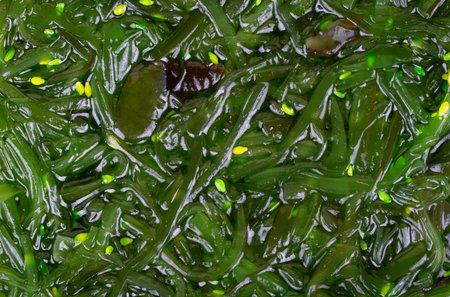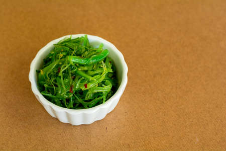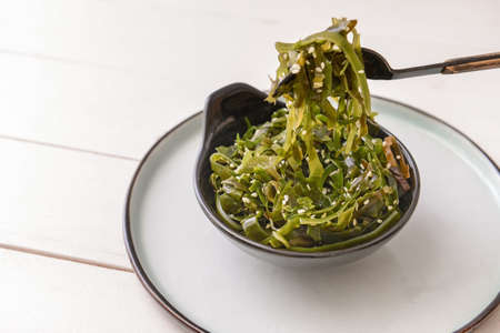 Wakame seaweed chuka salad with sesame. Background image of seaweed lettuce. Useful algae - wakame.