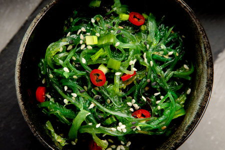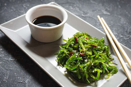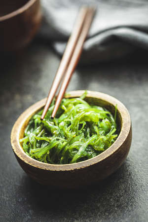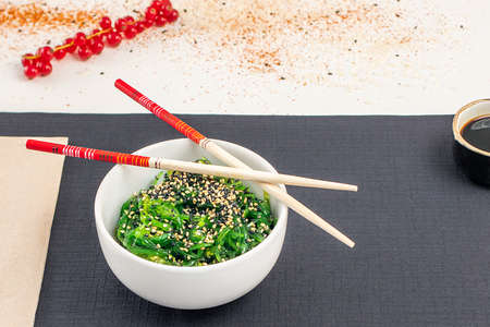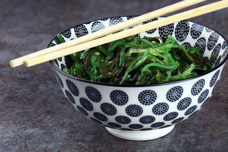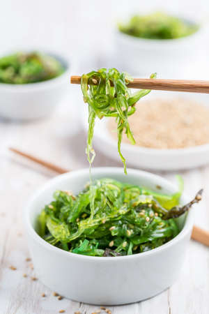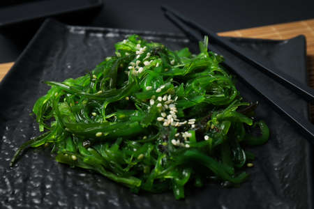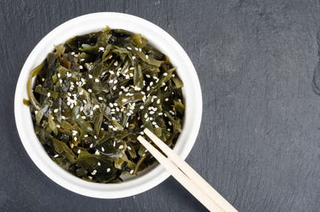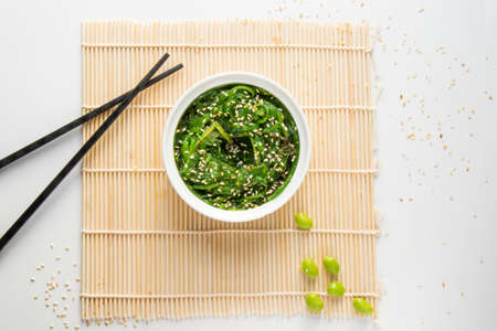 Traditional Japanese wakame salad with sesam seeds. Healthy and fresh seaweed salad.