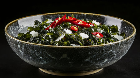 A beautifully plated Wakame seaweed salad with sesame seeds, soy sauce, and a sprinkle of chili flakes, served in a traditional Japanese dish.