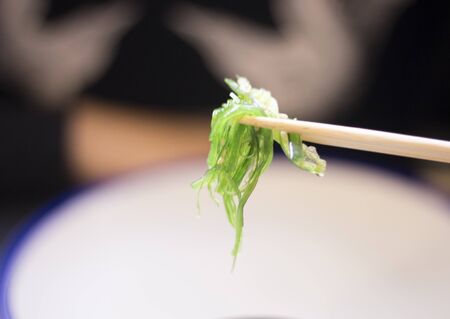 Japanese restaurant sushi oriental seaweed sushi como wakame food dish in bowl and traditional Asian wooden chopsticks photo.