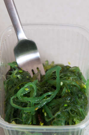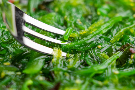 Delicious marinated green wakame seaweed salad with sesame seeds and fork close up