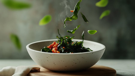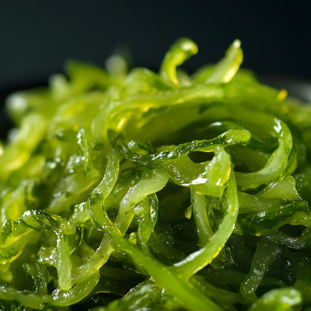 A vibrant bowl filled with fresh green seaweed showcases its unique texture and color. Perfect for culinary themes, healthy eating, and nature-inspired designs.