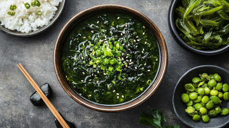 An overhead shot of a traditional Japanese table setting featuring a bowl of seaweed soup, accompanied by rice and pickled vegetables, showcasing the harmony of flavors in Japanese cuisine.