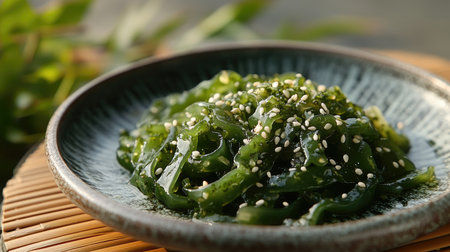 A vibrant seaweed salad garnished with sesame seeds on a decorative plate. Perfect for showcasing healthy Asian cuisine in dining settings.