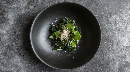 A perfectly plated portion of wakame seaweed salad with sesame seeds, served on a matte black plate with a subtle moody background.