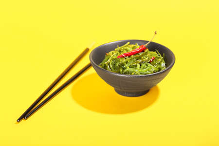 Bowl with healthy seaweed salad and chili pepper on yellow background