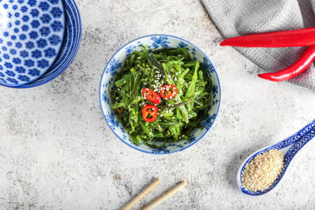 Bowl with healthy seaweed salad, sesame and chili pepper on light background