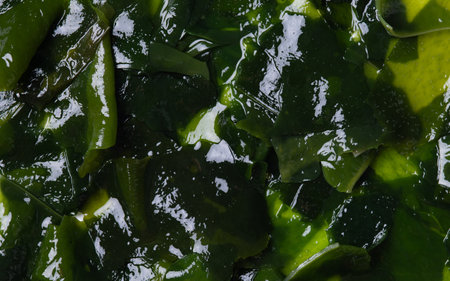 Extreme close up background of green wakame seaweed salad, elevated top view, directly above