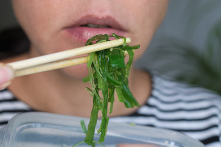 Close-up of a person savoring seaweed salad with chopsticks, emphasizing the texture and vibrant appearance. Concept: Showcasing seaweed as a delicious and healthy addition to a balanced diet.