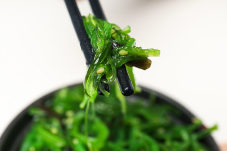 Traditional Japanese wakame salad with sesame seeds - asian food. Healthy and fresh seaweed salad close up