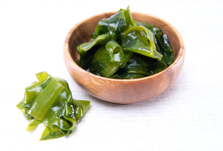 Laminaria (Kelp) seaweed wakame in wooden bowl. Japanese healthy food.