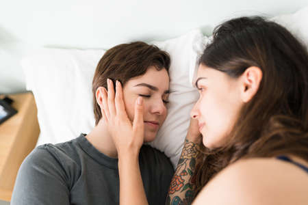 Close up of lesbian couple lying on bed