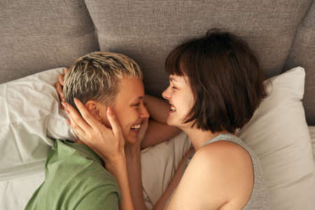 Young laughing lesbian couple rest and hug on bed