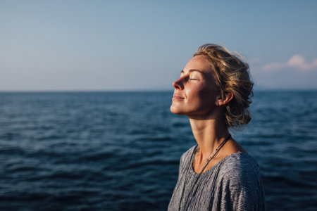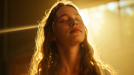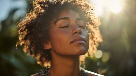 A young woman basks in the warmth of setting sun eyes closed savoring tranquility of nature.