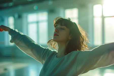 A woman stands with arms wide open, smiling towards the sun. The photo presents a medium shot of her against the ocean. Warm sunlight bathes the scene. Soft colors and a shallow depth of field create a peaceful atmosphere. Ideal for conveying joy and serenity in various visual projects.
