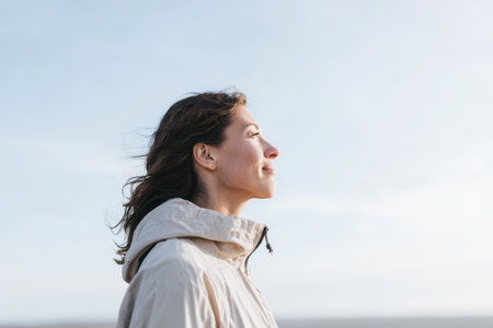 A woman stands at the beach with a slight smile, facing the sky. The day is bright and sunny, and her hair moves with the breeze. She enjoys the moment outdoors.