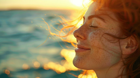 A close-up profile captures a young woman with wet hair tilting her head back and closing her eyes to enjoy the warm sunset light on a beach. The blurred ocean background highlights serenity, mindfulness, and connection with nature.